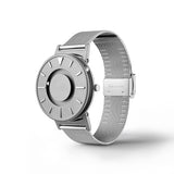 我們都曾經歷無法抬起手錶確認時間的時候,比如會議、上課、面試、商務晚宴等,這些場合都不適合看時間。因為「看」這個動作尷尬且沒禮貌。EONE設計團隊打造「觸的到的時間」,運用瑞士石英機芯、鈦金屬製造,以建築結構與磁力原理,將時針與分針分為上下兩層,並以兩顆滾的鋼珠來顯示時間。表面的鋼珠是分鐘,表側鋼珠為小時。如果鋼珠滾離原來位置,輕輕晃一下,磁力便會帶它們回到原位。從此,看時間不再只有一種方式,優雅的觸摸也是另一種選擇。